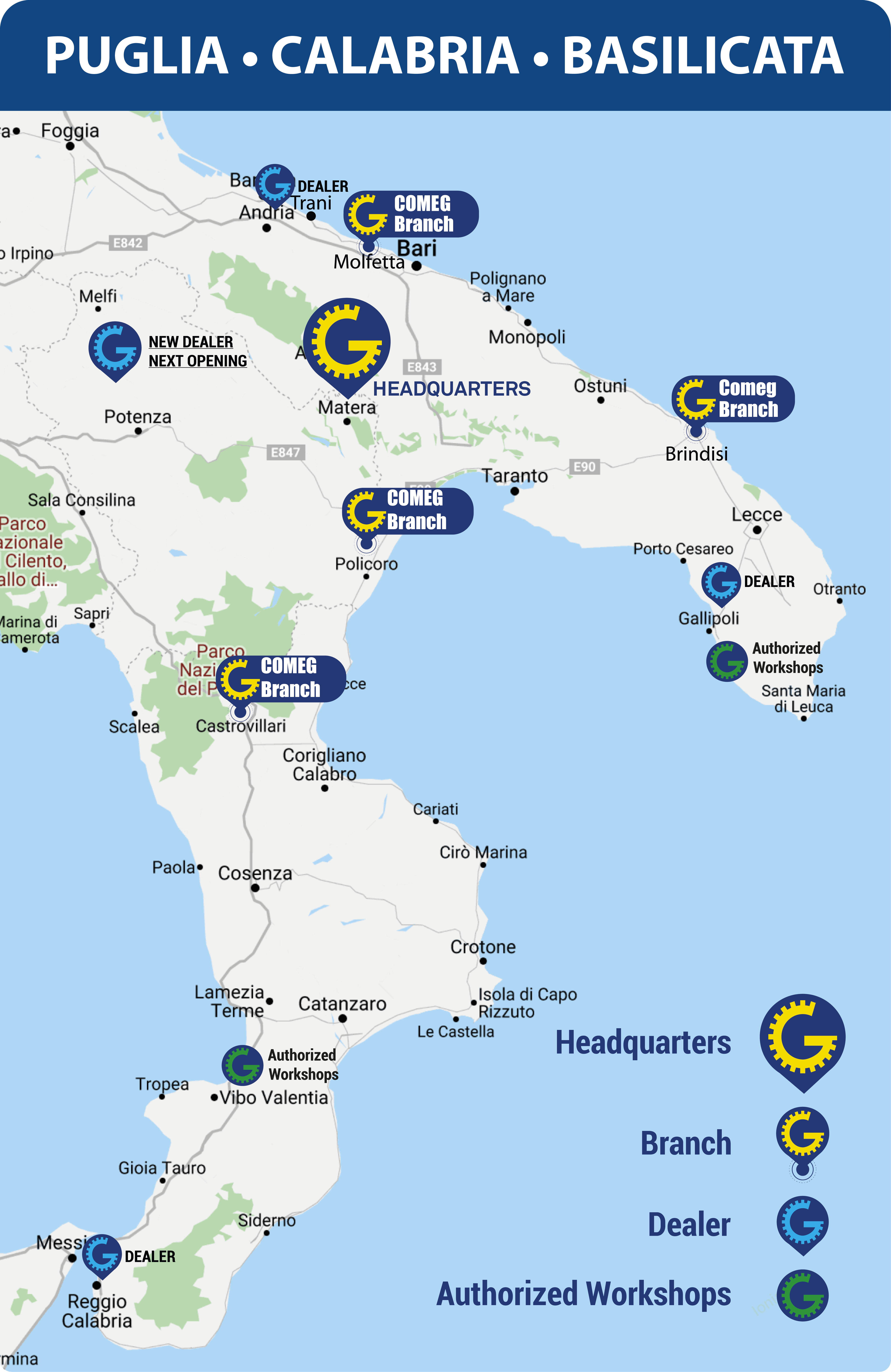 CO.M.E.G. S.r.l. non è soltanto vendita e noleggio, ma anche commercializzazione di ricambi e fornisce servizio di assistenza con quattro sedi operative situate in Puglia – Basilicata – Calabria tutte autonome e fornite di macchine nuove e ricambi originali e nazionali dei marchi più prestigiosi (KOMATSU – CATERPILLAR – HITACHI – VOLVO etc.